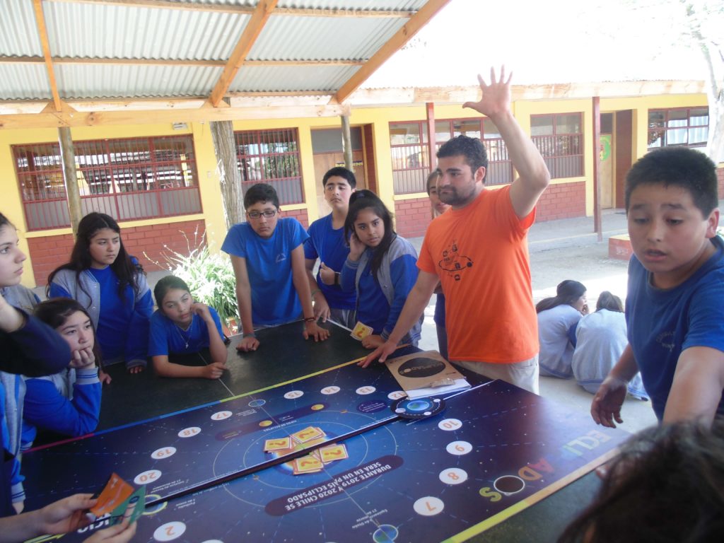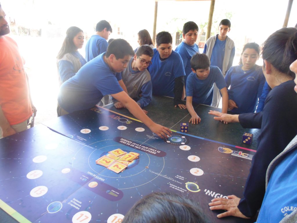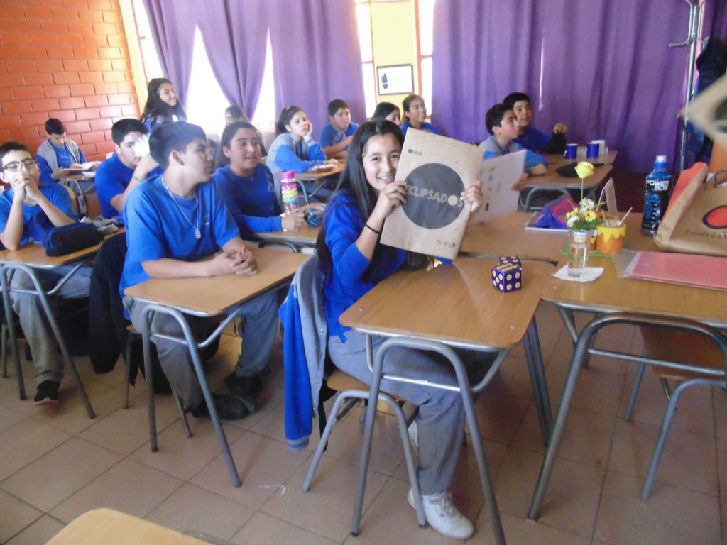 La actividad se realizó con estudiantes del Segundo Ciclo de Educación Básica y tuvo como propósito reforzar conocimientos sobre el movimiento de rotación y traslación de la Tierra y como se producen los eclipses, potenciando el trabajo en equipo, comunicación y colaboración, a través de un juego de mesa llamado “Eclipsados”, creado por el Centro Interactivo de Ciencias, Arte y Tecnología (CICAT) de la Universidad de Concepción. La actividad tuvo una duración estimada de 60min.